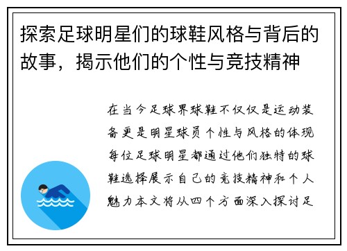 在绿色的球场上,足球明星们以他们卓越的技艺和顽强的意志闪耀着光芒。本文将通过四个方面深入探索这些足球巨星的传奇故事与精彩瞬间,从他们的成长背景、职业生涯的巅峰时刻、对社会的影响,到个人魅力和团队精神。每位足球明星都如同一颗璀璨的明珠,他们不仅仅是运动员,更是无数人心目中的偶像与榜样。通过本篇文章,我们将带你领略足球世界中那些动人的瞬间,以及背后不为人知的艰辛与努力。 1、成长背景与启蒙 每位足球...